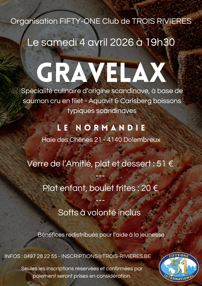 Soirée Gravelax - 4 avril 2026 Écrit le 28 février 2026. Publié dans Actualités. Nous organisons une soirée Gravelax ce samedi 4 avril 2026 au profit des associations et asbl que nous soutenons. Suivant